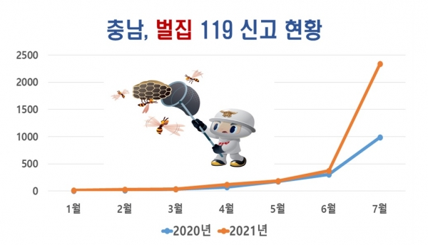 13일 도 소방본부의 통계에 따르면 올해 7월말 기준 벌집 관련 신고는 3087건으로 작년 같은 기간 1595건에 비해 두 배 가까이 증가했다.