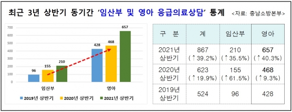 [세종타임즈] 충남소방본부는 최근 3년 상반기 응급의료상담 통계 분석 결과, 임산부와 유아 관련 상담이 지난해 623건에서 올해 영아 657건, 임산부 210건으로 대폭 증가했다고 발표했다.