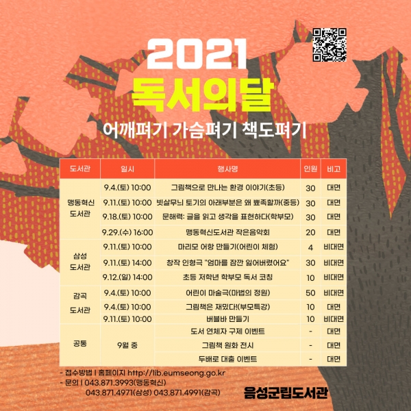 이번 행사는 군민들의 독서문화 저변을 확대하기 위해 맹동혁신도서관·삼성도서관·감곡도서관 등 3개 도서관에서 온라인과 오프라인을 병행해 운영한다.