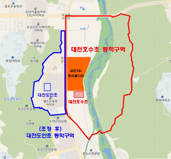 행정예고안에 따르면 가수원동 43통 일부, 44통~47통을 대전호수초등학교 통학구역으로 설정하고 이에 수반되는 대전도안초등학교의 일부 통학구역을 조정한다.