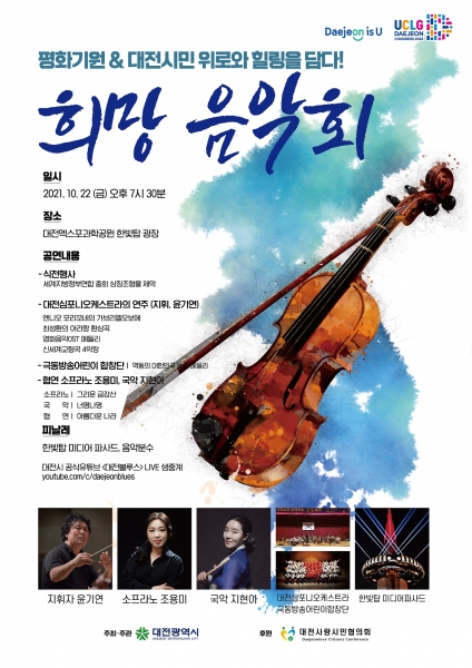 [세종타임즈] 대전시는 오는 22일 오후 7시 30분 대전엑스포과학공원 한빛탑광장에서 시민 위로와 평화 기원을 담은 ‘희망 음악회’를 개최한다고 18일 밝혔다.