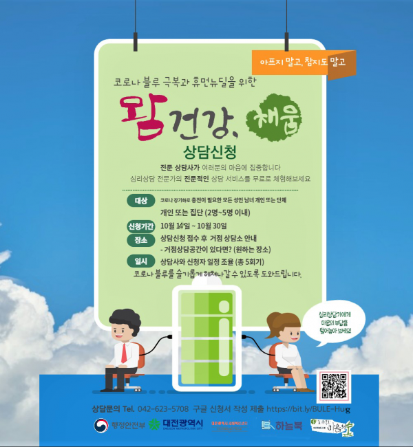이번 사업은 ‘뫔 건강, 채움’이라는 주제로 코로나 장기화로 인해 마음 충전이 필요한 시민들을 대상으로 심리 건강상담을 제공하는 코로나블루 극복 프로젝트다.