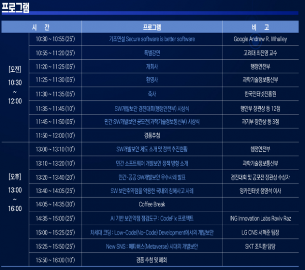과학기술정보통신부, 행정안전부와 한국인터넷진흥원은 11월 5일 ‘제11회 소프트웨어 개발보안 학술회의’를 개최한다고 밝혔다.