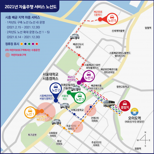 자율주행 모빌리티 서비스 시범사업은 민간의 자율주행 서비스 조기 사업화를 촉진하기 위해 지난해 4월, 공모를 거쳐 서울대 산학렵력단 컨소시엄을 사업자로 선정해, ‘20.5월부터 자율차 제작 및 인프라 구축을 통해 경기도 시흥 배곧신도시 일대에서 심야시간에 대중교통이 불편한 거주민이 이용할 수 있도록 심야 안전귀가 셔틀 서비스 등을 제공하고 있다.
