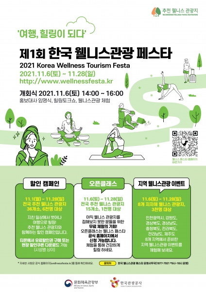 [세종타임즈] 문화체육관광부와 한국관광공사는 오는 11월 6일부터 28일까지 웰니스 관광상품 할인 및 무료체험행사를 중심으로 하는 ‘제1회 한국 웰니스관광 페스타’를 개최한다.