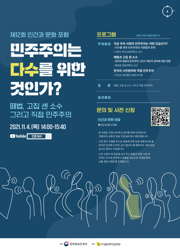 [세종타임즈] 문화체육관광부는 한국출판문화산업진흥원과 함께 오는 11월 4일 오후 2시, ‘민주주의는 다수를 위한 것인가? - 떼법, 고집 센 소수 그리고 직접 민주주의’를 주제로 열두 번째 ‘인간과 문화 포럼’을 개최한다.