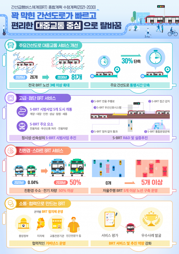 BRT 차량의 친환경차 전환을 추진해 전기·수소 등 친환경차 비중을 ’20년 0.04%에서 ‘30년 50%까지 늘릴 계획이라고 전했다.