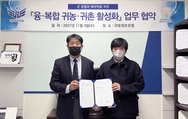 [세종타임즈] 지난 11월 3일 국방정보포털과 농어촌살리기범국민운동본부가 군 장병들이 전역 후 안정적인 생활을 할 수 있도록 ‘융·복합 귀농·귀촌 활성화’를 위한 업무협약을 체결했다.