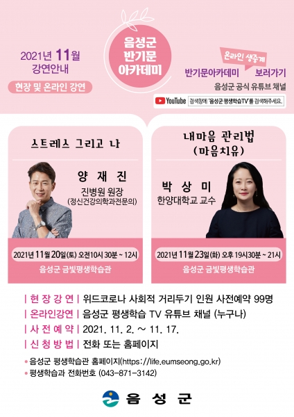 8일 군에 따르면, 이번 반기문 아카데미는 금빛평생학습관에서 진행되며 정신건강의학과 전문의인 양재진 원장의 ‘스트레스 그리고 나’ 및 심리상담가 박상미 한양대학교 교수의 ‘내 마음 관리법’이란 주제로 진행된다.