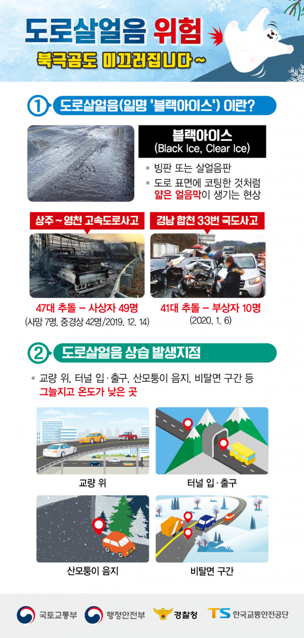국토교통부 이윤상 도로국장은 “정부는 겨울철 도로사고 예방을 위해 사전 대비에 만전을 기하고 폭설이나 살얼음이 발생되는 경우에는 즉시 국민께 상황을 알리고 신속히 위험요소를 제거하는데 노력을 집중할 것”이라며 가장 효과적인 안전대책은 안전운전이므로 도로 이용자 분들께는 ‘도로 살얼음 위험 및 교통사고 예방수칙’과 ‘눈길 안전운전요령’을 숙지·준수해 주시고 눈길에서는 가급적 대중교통을 이용해 주시길 부탁드린다”고 말했다.