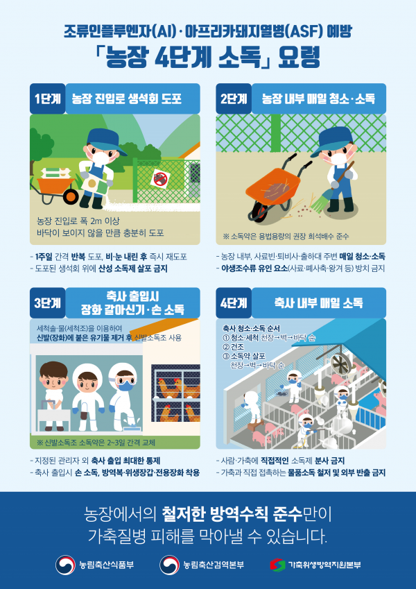 중수본은 오늘 긴급방역상황회의를 개최하고 “고병원성 조류인플루엔자 예방과 확산 방지를 위해 농장진입로 생석회 도포, 축사 출입 시 장화 갈아신기·손 소독, 축사 내 ·외부 매일 청소 등 농장 4단계 소독을 철저히 실시해야 한다”고 강조했다.