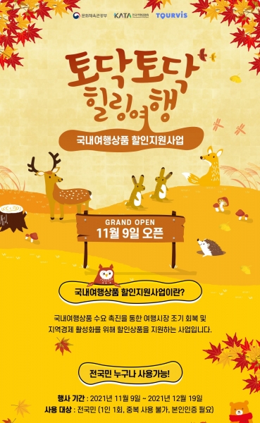 [세종타임즈] 문화체육관광부는 한국여행업협회와 함께 단계적 일상 회복에 발맞춰 ’20년 11월 이후 중단했던 국내 여행상품 할인 지원 사업[토닥토닥 치유 여행]을 11월 9일부터 재개한다.