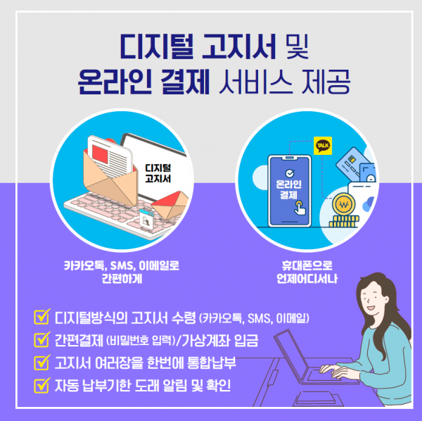 앞으로 항만시설 이용자는 해운항만물류정보시스템의 디지털 고지·납부 기능을 활용해 카카오톡, SMS 메시지, 이메일을 통해 전자고지서를 받을 수 있게 되며 은행이나 간편결제 앱, 가상계좌 입금 등 본인이 원하는 다양한 결제 방식으로 납부할 수 있게 된다.