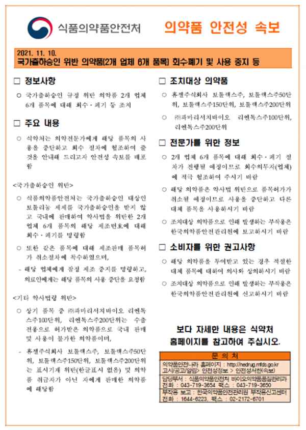 식약처는 위반 품목에 대한 행정처분 절차 착수와 함께 해당 품목이 국내에 유통되지 않도록 회수·폐기 명령을 내렸습니다.