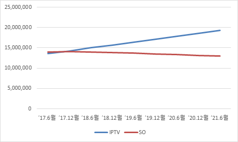’21년 상반기 기준, 유료방송 가입자 수는 35,107,369명으로 집계되어 ’20년 하반기 대비 52만명이 증가했다.