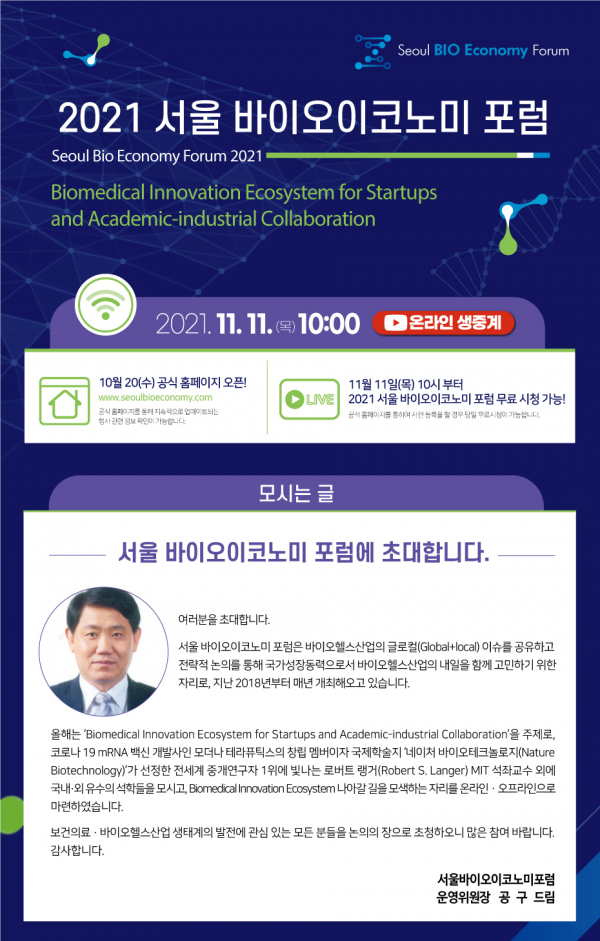 2018년 이후 네 번째로 개최되는 이번 포럼은 “스타트업을 위한 바이오 혁신 생태계 구축과 산·학 협력”을 주제로 해 현장 참여 및 비대면 인터넷 영상회의로 진행한다.