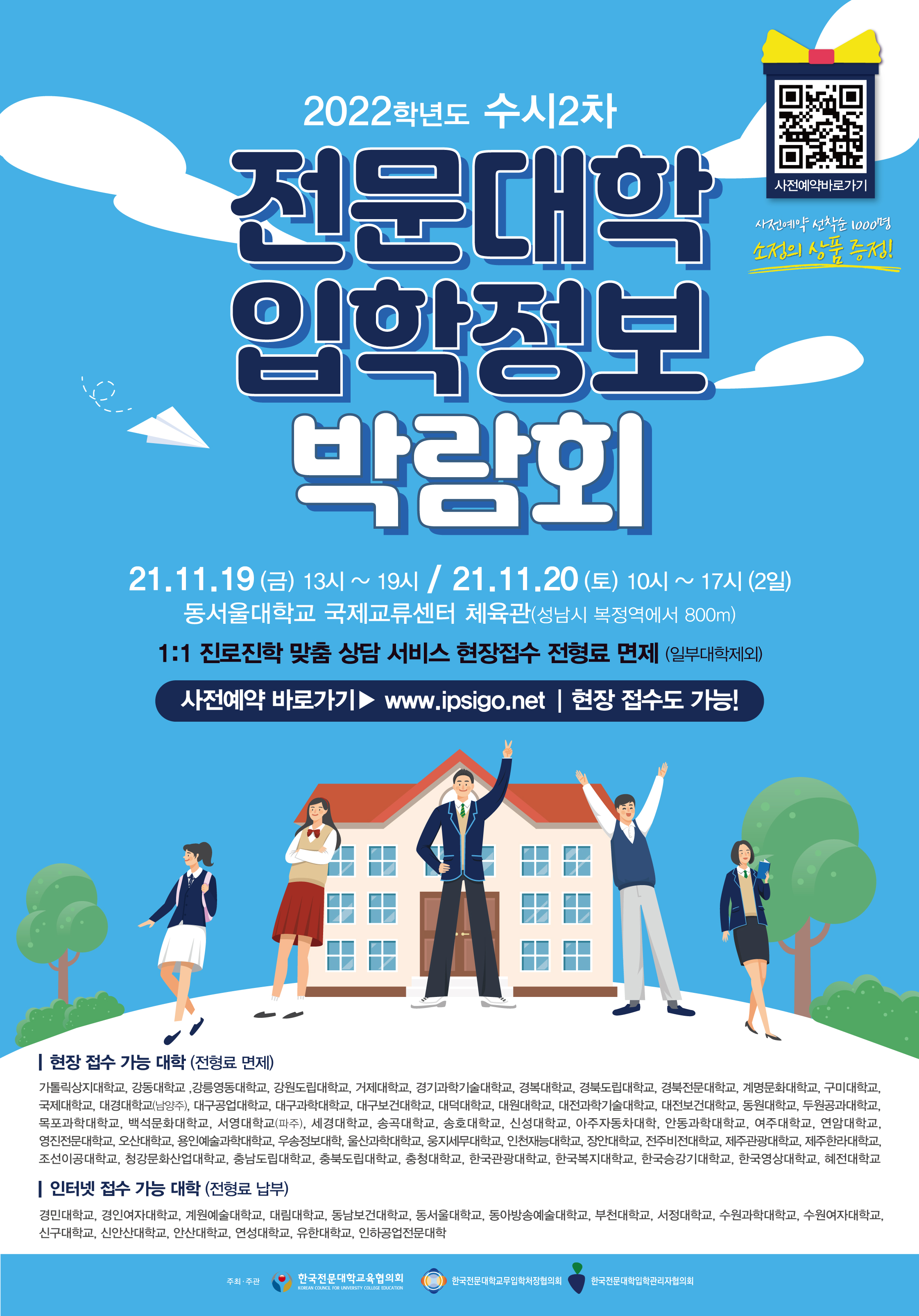 이번 박람회에는 한국영상대학교 등 전국 71개 전문대학이 참여하며, '2022학년도 수시 2차 전문대학 입학정보 박람회' 공식 누리집(https://www.ipsigo.net/main.htm)을 통해 사전 예약이 가능하다.