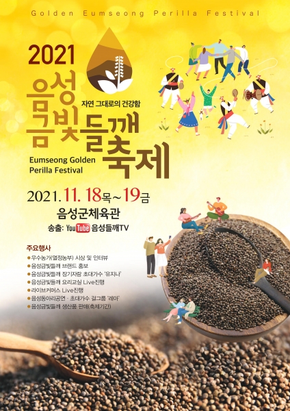 [세종타임즈] 음성군은 오는 11월 18일부터 11월 19일까지 2일간 음성 실내체육관과 유튜브에서 온라인 비대면 방식으로 ‘2021 음성 금빛들깨 축제’를 개최한다고 밝혔다.