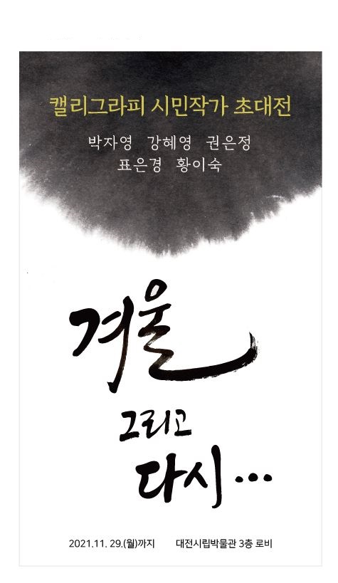 이번 전시에는 소담캘리아트센터의 박자영 작가 등 5명의 시민작가들이‘겨울, 그리고 다시.’라는 부제로 좋은 시와 글귀 등을 담은 30여점의 캘리그라피 작품들을 시립박물관 3층 로비에 전시할 예정이다.