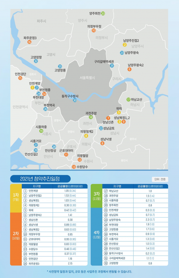 이번에는 3기 신도시인 하남교산 1천호, 과천주암 1.5천호, 시흥하중 7백여호 등 총 4천여호가 공급되며 다음 달에는 남양주왕숙·부천대장·고양창릉 등 3기 신도시 5천 9백호와 구리갈매역세권·안산신길2 등의 입지에서도 사전청약이 진행된다.