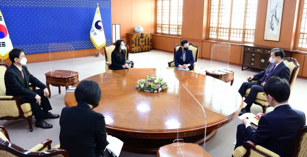 [세종타임즈] 정의용 외교부장관은 17일 오전 ‘어우 보첸’ 3국협력사무국[TCS] 제6대 사무총장을 비롯해 ‘백범흠’, ‘사카타 나츠코’ 사무차장 등 ‘한중일 3국협력사무국’ 사무총장단을 접견, 그간의 3국 협력을 평가하고 향후 발전 방향 등에 대해 의견을 교환했다.