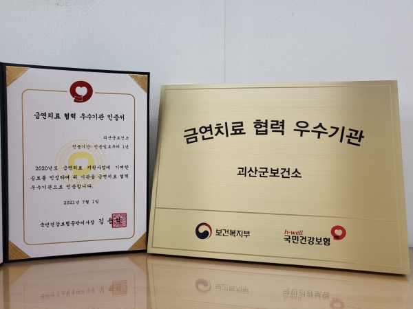 [세종타임즈] 충북 괴산군 보건소는 국민건강보험공단으로부터 ‘2020년 금연치료 협력 우수기관’으로 선정되어 인증서 및 인증현판을 수여받았다고 밝혔다.