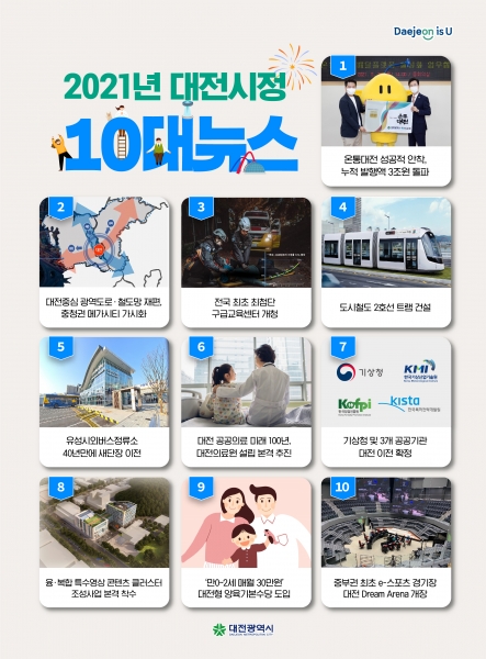 허태정 대전시장은 “10대 뉴스 선정은 시민과 함께 올 한해의 성과를 되돌아봄과 동시에, 더 나은 미래로 나아가고자 하는 의지를 다질 수 있는 계기”며 “대전의 대표 브랜드가 된 온통대전을 비롯해 시민들께서 관심을 가져주신 여러 사업들을 앞으로도 차질 없이 추진해 나가겠다”고 밝혔다.