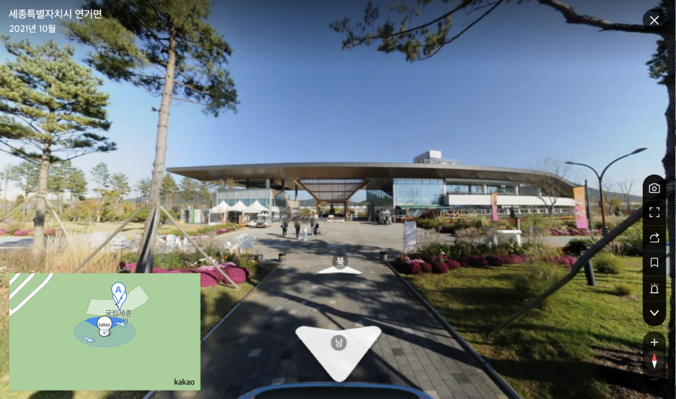 수목원 로드뷰는 카카오맵에서 ‘국립세종수목원’을 검색한 후 로드뷰 아이콘을 클릭하면 로드뷰 서비스 제공 구간이 파란색으로 활성화되며, 원하는 지점을 클릭하면 비대면으로 수목원을 관람할 수 있다.