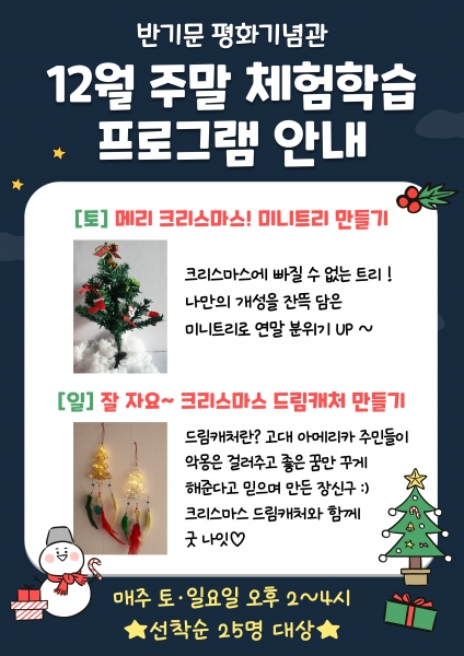 토요일에는 ‘메리 크리스마스 미니트리 만들기’, 일요일에는 ‘잘 자요~ 크리스마스 드림캐처 만들기’를 한다.