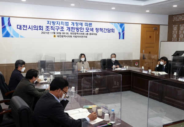 [세종타임즈] 대전시의회 지방자치 연구회는 회장 채계순 의원 진행으로 지난달 30일 시의회 중회의실에서‘지방자치법 개정에 따른 대전시의회 조직구조 개편방안 모색 정책간담회’를 개최했다.