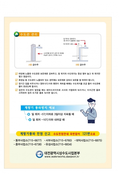 수도 계량기가 동파되었을 경우에는 우선 계량기 밸브를 잠그고 “☎ 042-121번”으로 신고하면 신속한 서비스를 받을 수 있다.