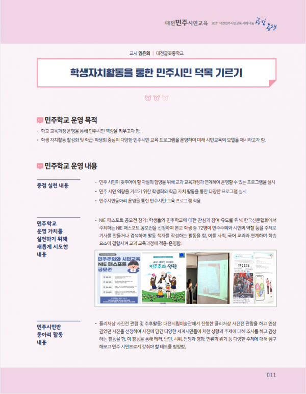 ‘민주학교 및 공간수업 프로젝트’에서는 학교 교육과정 내 민주시민교육을 강화하고 학생 주도로 학교 공간을 재구조화하는 프로젝트를 통해 민주시민의 가치를 교육활동 전반에 반영하는 모습을 보여주고 있으며 ‘민주시민 학생토론 동아리’에서는 교과 및 학교생활을 연계한 토론 활동을 소개하고 있다.