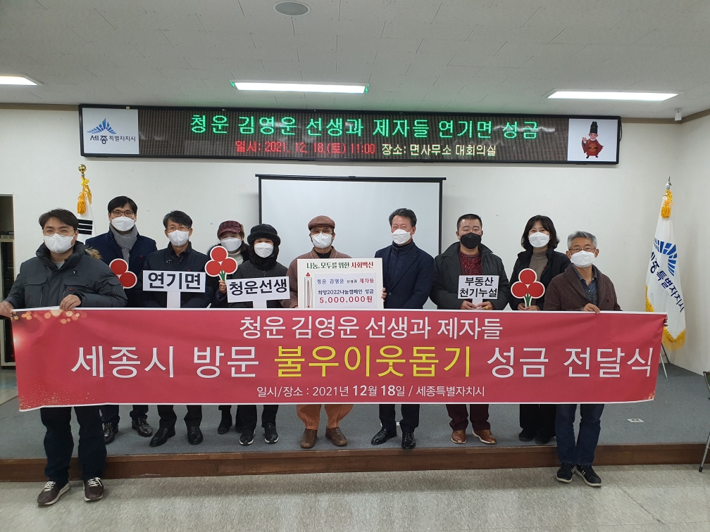 청운선생이 제자들과 십시일반 모은 성금은 세종사회복지공동모금회를 통해 연기면지역사회보장협의체로 지정 기탁되며, 기탁식은 코로나19 방역수칙을 준수해 진행됐다.