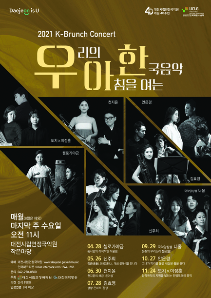 K-브런치콘서트 ‘우.아.한’은 대전국악방송과 공동으로 우리 지역 전통음악 인프라 확충과 국악의 대중화, 생활화를 위해 국내외에서 활발하게 활동하고 있는 최고의 연주자들과 함께 클래식, 재즈 등 다양한 장르와의 경계를 넘나드는 음악으로 새로운 감동을 선사한다.