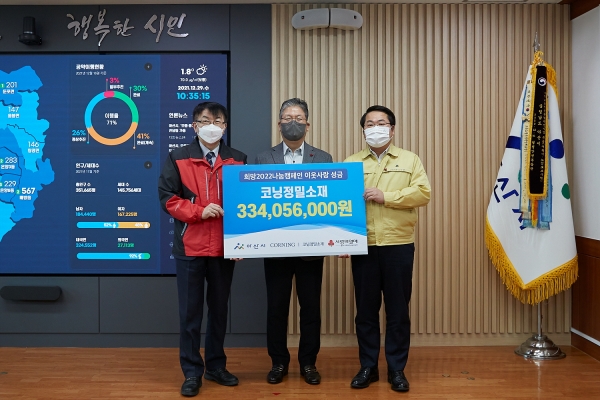 이번 성금은 코닝정밀소재 임직원이 1년 동안 매월 자발적으로 기부한 금액 8523만1000원과 회사의 특별 출연금 2억4882만5000원이 모아 마련된 것으로 충남사회복지공동모금회로 전달해 아산 지역 취약계층 지원 사업에 쓰일 예정이다.