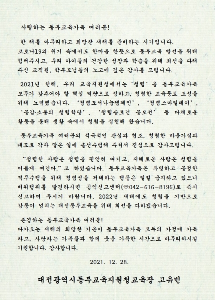 [세종타임즈] 대전광역시동·서부교육지원청은 연말연시를 맞이해 청렴실천의지를 담은 교육장 서한문을 관내 교직원들에게 발송했다고 밝혔다.