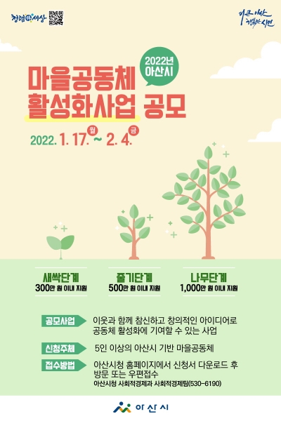 [세종타임즈]아산시가 다음 달 4일까지 ‘2022년도 아산시 마을공동체 활성화사업’을 공모한다.