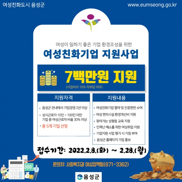 [세종타임즈] 음성군은 여성이 일하기 좋은 근로 환경 조성에 노력하는 기업을 여성친화기업으로 인증하고 환경개선 사업비를 지원하는 ‘여성친화기업 환경개선사업’에 관심이 있는 기업을 모집한다.