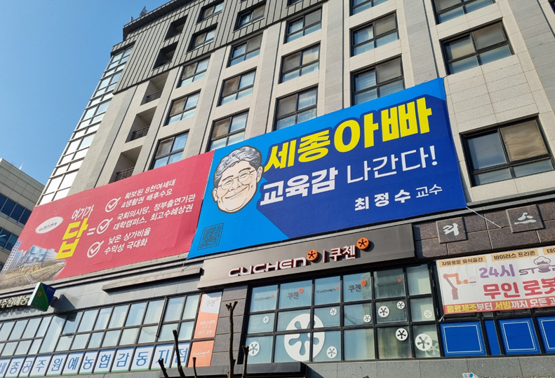 [세종타임즈] 세종시 교육감 선거 최정수 예비후보가 나성동에 위치한 최정수 선거사무실 외벽에 ‘세종아빠, 교육감 나간다’는 현수막을 내걸고 시민들에게 얼굴을 알렸다.
