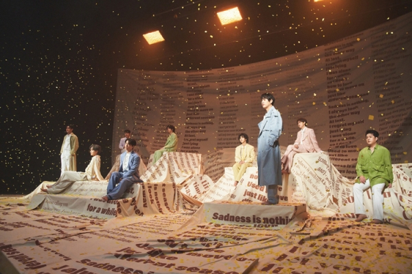 'Sadness in nothing'을 비롯한 영어 문구가 적힌 천, 반짝이는 금색 꽃가루가 슈퍼주니어의 색다른 분위기를 기대하게 만든다.