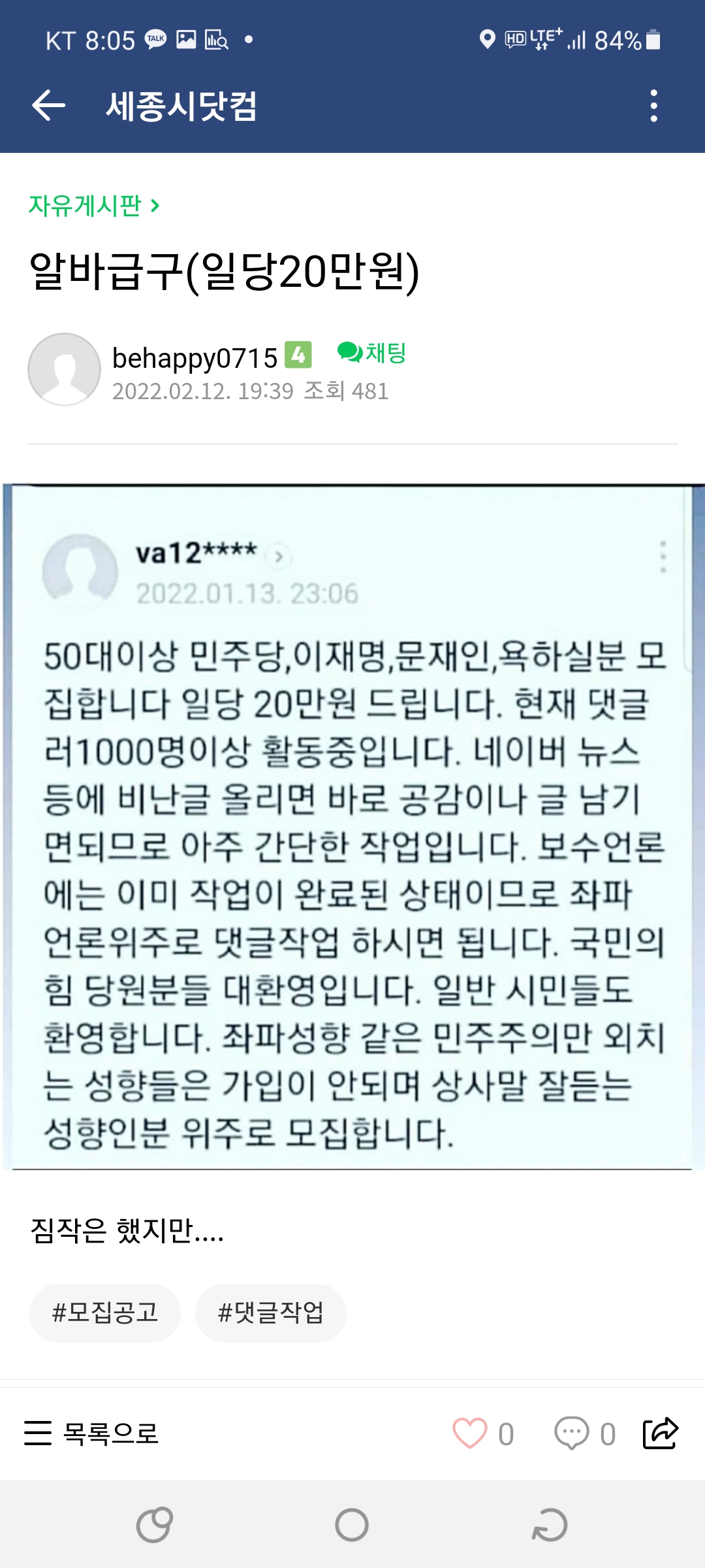 ‘댓글 알바생 모집해 댓글 조작하는 국힘당’이라는 제목의 글이 떠돌고 있다. (증거자료 첨부) 증거자료에서 보듯이 va12****와 behappy0715는 선관위가 마음만 먹으면 당사자를 특정할 수 있다. 아울러 82cook 자유게시판에 떠돌던 것도 즉시 조사에 착수할 것을 촉구한다. 이런 명백한 증거에도 조사에 차일피일한다면 선관위가 공정한 심판자의 자격이 없다.