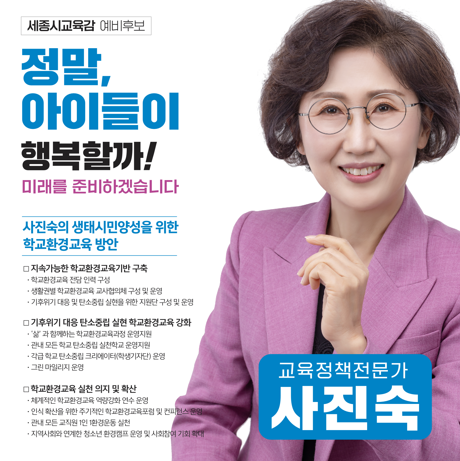 사진숙 후보는 “환경교육은 학교현장과 시민사회가 유기적 거버넌스 체계를 갖춰 지역사회로 확산시키는 것이 중요하다”며 “미래세대 우리 아이들이 깨끗한 공기와 기후위기 없는 세상에서 살아갈 수 있도록 교육자로서 힘쓰겠다”고 말했다.