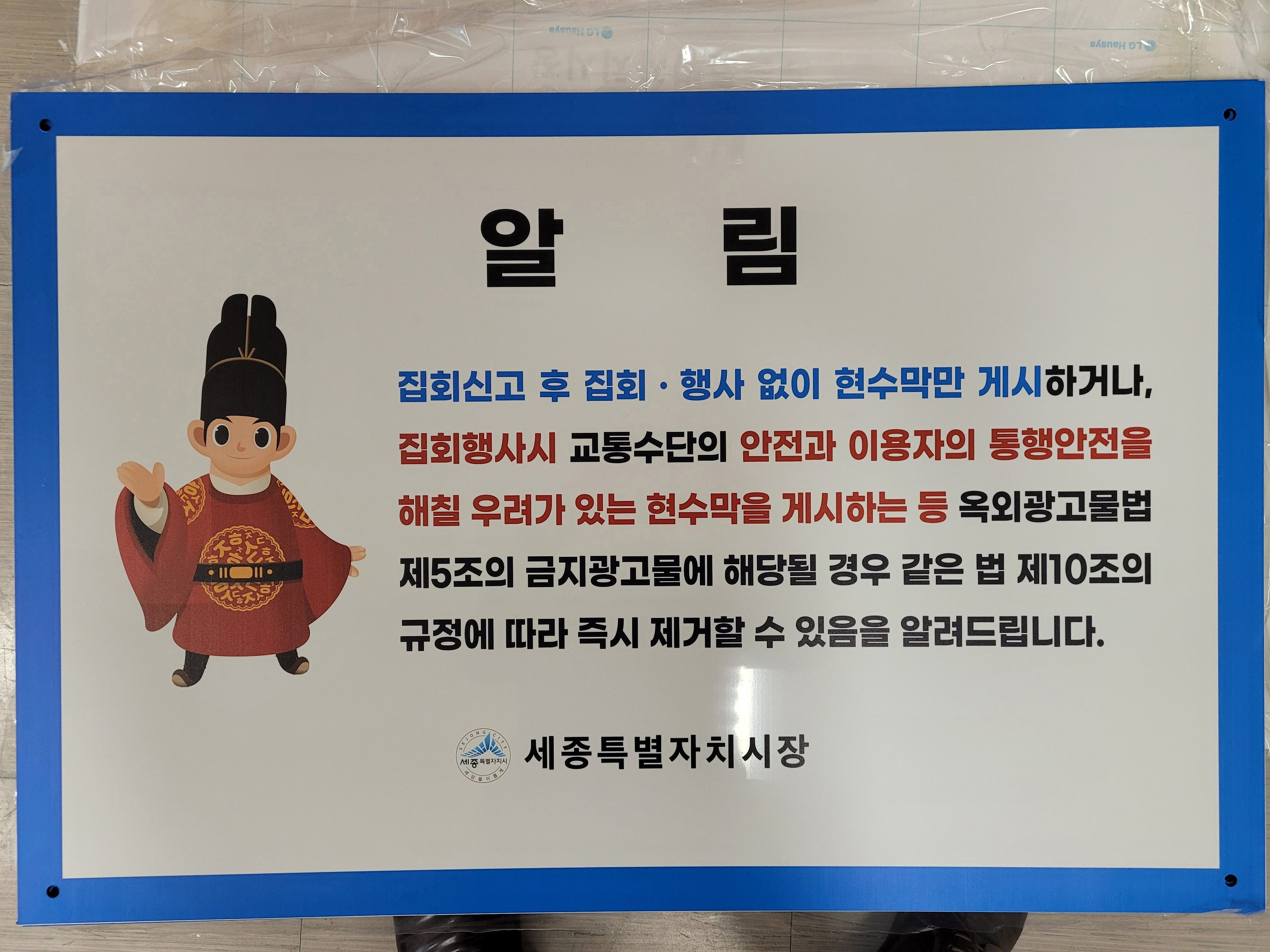 [세종타임즈] 세종특별자치시가 이달 말부터 어진동 정부청사 일원 집회주요 장소에 집회 현수막 근절을 위한 안내판 56매(90㎝×60㎝)를 부착하고 불법집회현수막 근절에 나선다.