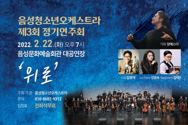 음성청소년오케스트라는 장에스더 지휘자와 6명의 강사가 바이올린, 첼로 플루트 클라리넷, 타악, 트럼펫을 지도하고 있으며 초등학생부터 고등학생까지 30여명의 음성군 학생들로 구성돼 있다 이번 연주회는 2018년 창단연주회 이후 세 번째 정기연주회로 어린 꿈나무들이 그동안 열심히 배우고 익힌 연주 솜씨를 발표하는 뜻깊은 자리다.