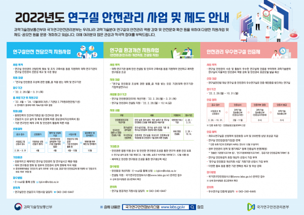 ‘연구실 안전환경 조성에 관한 법률’, 하위법령 및 행정규칙에 관한 주요 개정사항과 ’22년 연구실 안전관리 현장검사 준비사항 등을 안내할 예정이다.