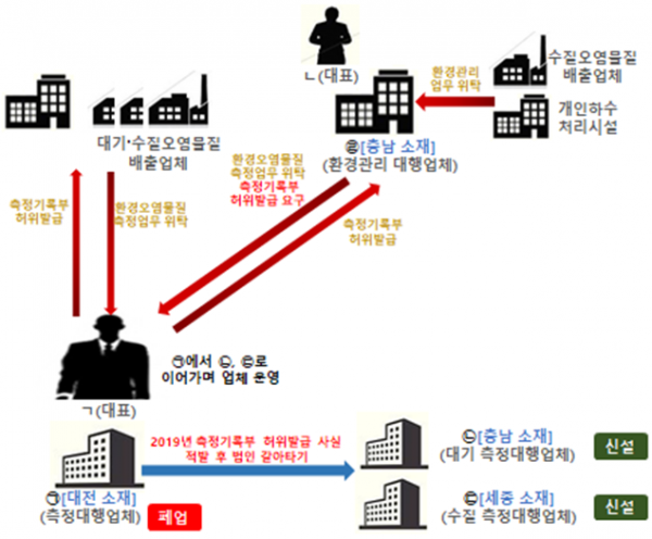 또한, ㄱ은 2019년 2월 무렵 대전광역시청과 국립환경과학원의 감사에서 ㉠측정대행업체의 측정기록부 거짓 발급이 적발되어 업체를 운영하기 어려울 것으로 예상되자, 2019년 4월 무렵 ㉠측정대행업체의 임원을 대표로 내세워 설립한 2개 법인에 기술 인력과 시설을 이전하고 2019년 8월부터 2020년 2월 무렵까지 측정대행업 등록을 하지 않은 채 측정대행 업무를 했다.