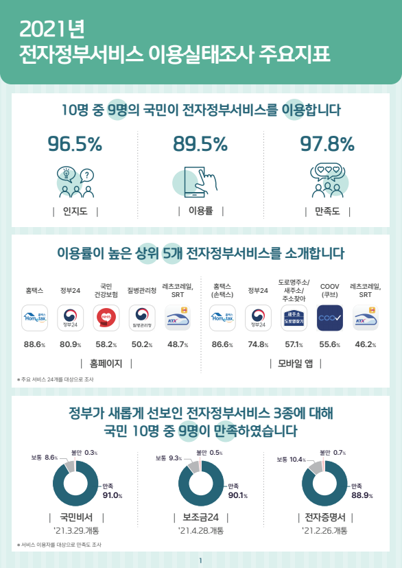 행정안전부는 한국지능정보사회진흥원과 함께 2021년 국민이 많이 이용한 전자정부서비스를 포함해 서비스의 인지도, 이용률, 만족도 등에 대한 이용실태 조사결과를 발표했다.
