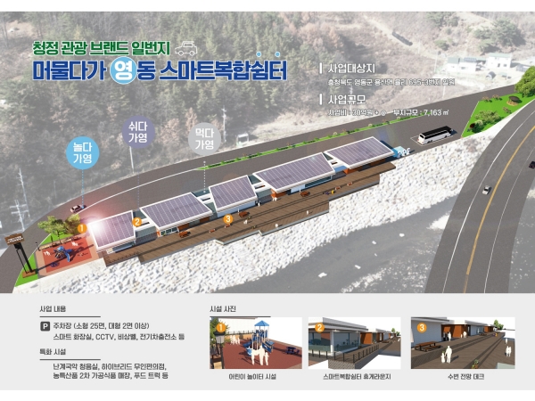 이번에 선정된 영동군의 ‘머물다 영동 스마트 복합쉼터’는 용산면 국도 19호선 인근의 초강천 수변공간에 조성될 예정이다.