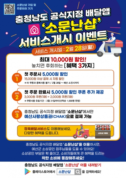 [세종타임즈] 예산군은 지역 화폐 사용이 가능한 충청남도 공식지정 배달 앱 ‘소문난 샵’ 서비스를 본격 개시했다.