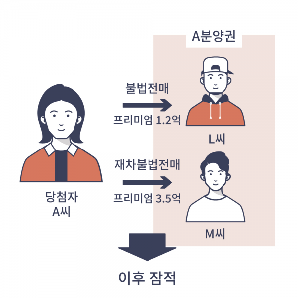 전매제한기간 중 이면계약을 체결한 후 전매제한기간이 끝나면 시행사와 분양권 권리의무승계 처리하는 방식의 불법전매 2건 등이다.